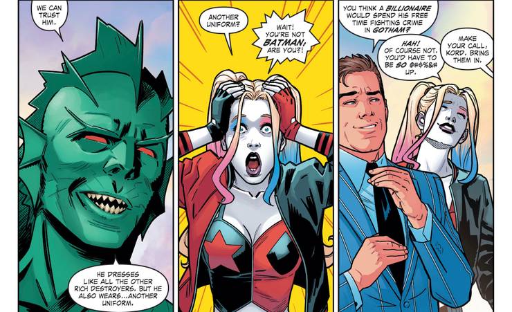 “Podemos confiar nele”, diz Fin. “Ele se veste igual qualquer cara rico, mas também veste outro uniforme”. A Arlequina quase surta: “Outro uniforme?! Você não é o Batman, né?” Kord se safa com uma desculpa simples, mas convincente: “Você acha que um bilionário iria gastar dinheiro e tempo combatendo o crime em GOTHAM?”