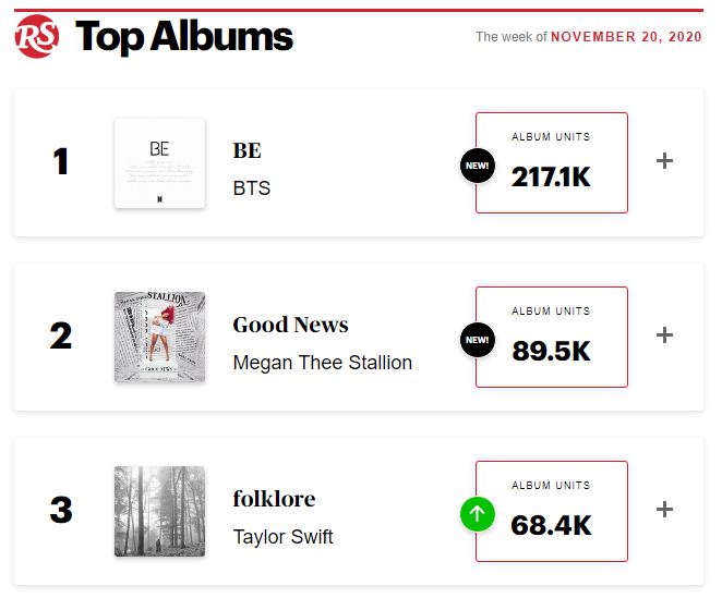 O álbum mais recente do BTS, intitulado BE, chegou às lojas norte-americanas no dia 20 de novembro e logo conquistou o primeiro lugar no ranking da Rolling Stone 200, que rastreia os lançamentos mais quentes da semana nos Estados Unidos.