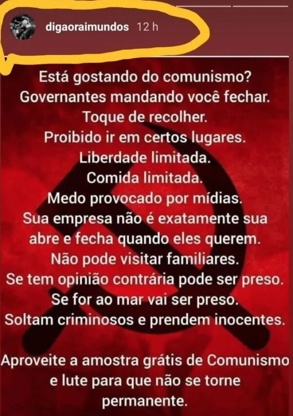 Ele completa: “Comida limitada. Medo provocado por mídias. Sua empresa não é exatamente sua. Abre e fecha quando eles querem. Não pode visitar familiares. Se tem opinião contrária pode ser preso. Se for ao mar vai ser preso. Soltam criminosos e prendem inocentes. Aproveite a amostra grátis de Comunismo e lute para que não se torne