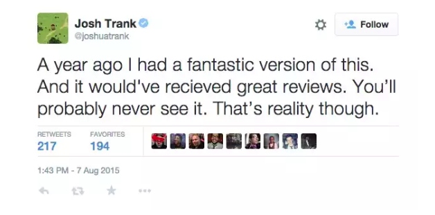 Josh Trank, diretor do polêmico Quarteto Fantástico de 2015, admitiu que lamenta um tuíte que custou à Fox cerca de US$ 10 milhões (o equivalente a R$ 50,8 milhões). Além de faturar apenas US$ 56 milhões no mercado interno – em contraponto ao custo estimado de US$ 120 milhões -, o filme foi amplamente criticado pelo público e pela mídia.