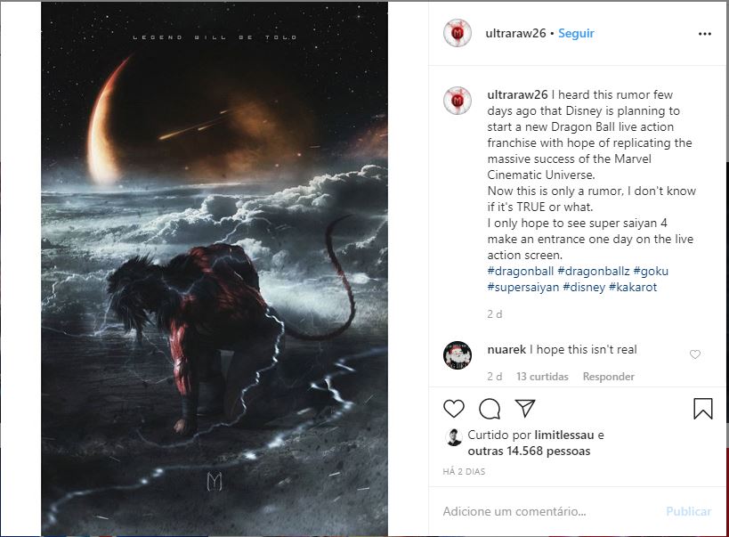 Em tradução livre: “Eu ouvi esse rumor um tempo atrás de que a Disney pode começar uma nova franquia live-action de Dragon Ball, com esperança de replicar o mesmo sucesso massivo do MCU. Agora, isso é apenas um boato, não sei se é VERDADEIRO ou o quê. Só espero ver o Super Sayajin 4 nos cinemas com um ator real.”