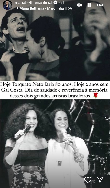 Dois dos grandes parceiros de Gal — na vida e na arte — Gilberto Gil e Maria Bethânia usaram seus perfis no Instagram para homenagear a amiga. Bethânia escreveu que hoje é um ‘dia de saudade e reverência à memória desses dois grandes artistas brasileiros,” falando também do poeta piauiense Torquato Neto, que completaria 80 anos hoje.