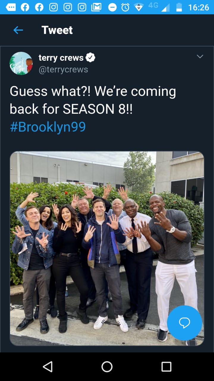 O ator, mais conhecido no Brasil pelo papel de Julius na série Todo Mundo Odeia o Chris, publicou no Twitter uma foto do elenco. Todos eles seguram oito dedos para cima para anunciar a oitava temporada.