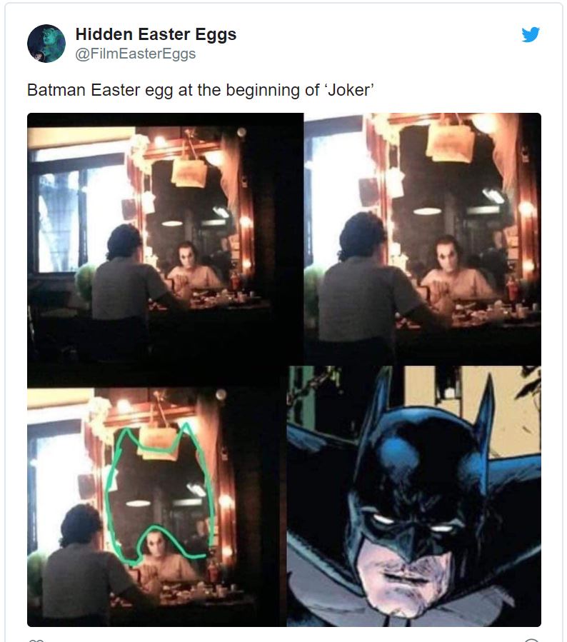 A suposta menção ao Homem-Morcego acontece logo no início do longa do Palhaço do Crime, no momento em que Arthur Fleck está no camarim. A cena parece mostrar o espelho da sala formando a máscara do Batman, visto da perspectiva da câmera.
