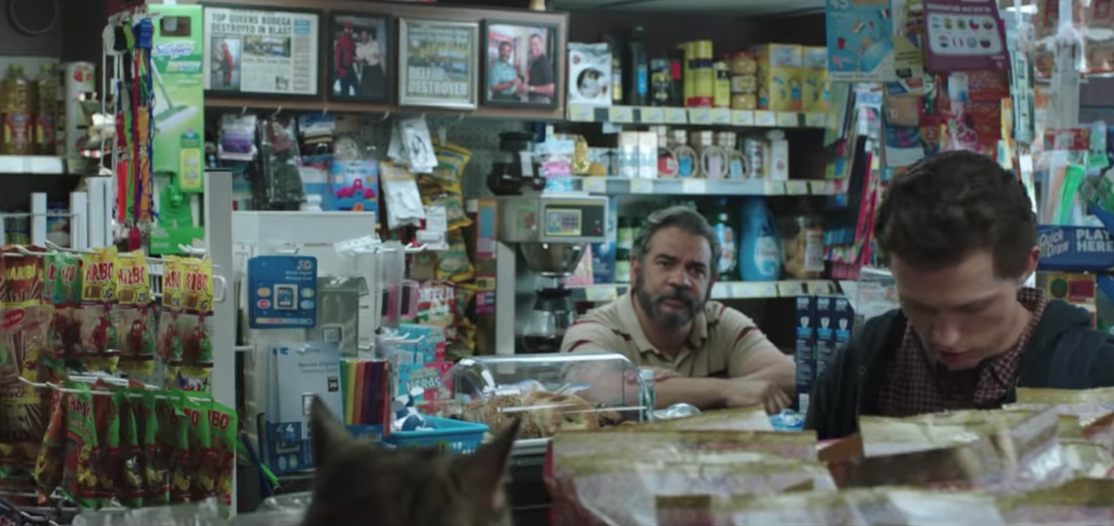 A lojinha de conveniência em que Peter Parker vai para comprar suprimentos para sua viagem escolar não é estranha aos fãs: é a mesma que o Homem-Aranha destruiu no filme anterior, De Volta ao Lar (2017). Atrás do caixa, é possível ver manchetes de jornais noticiando o ocorrido.