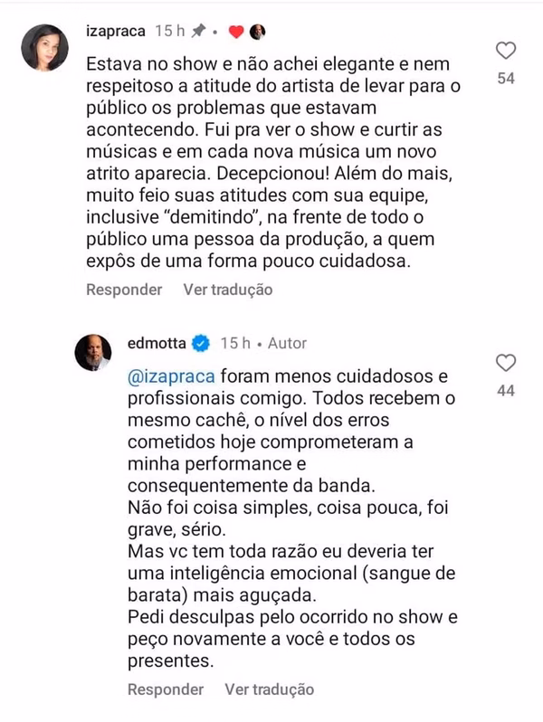 “Não foi coisa simples, coisa pouca, foi grave, sério. Mas você tem toda razão eu deveria ter inteligência emocional (sangue de barata) mais aguçada. Pedi desculpas pelo ocorrido no show e peço novamente a você e todos os presentes.