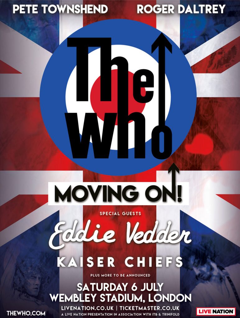 O The Who chamou o Eddie Vedder, do Pearl Jam, e o Kaiser Chiefs como convidados especiais do show no Estádio de Wembley, em Londres, no dia 6 de julho, a primeira data da turnê Moving On! no Reino Unido.