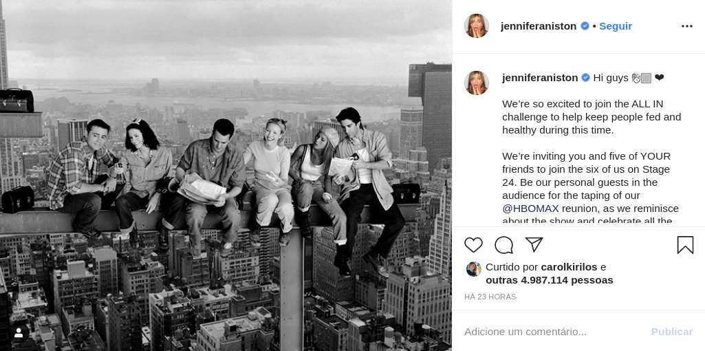 “Sejam nossos convidados pessoais na plateia para a gravação do nosso reencontro na @HBOMAX, enquanto nos lembramos do programa e celebramos toda a diversão que tivemos (…)”, escreveu Aniston nas redes sociais. “Esperamos que isso nos traga um pouco de alegria, e algo para aguardarmos ansiosos”, acrescentou.