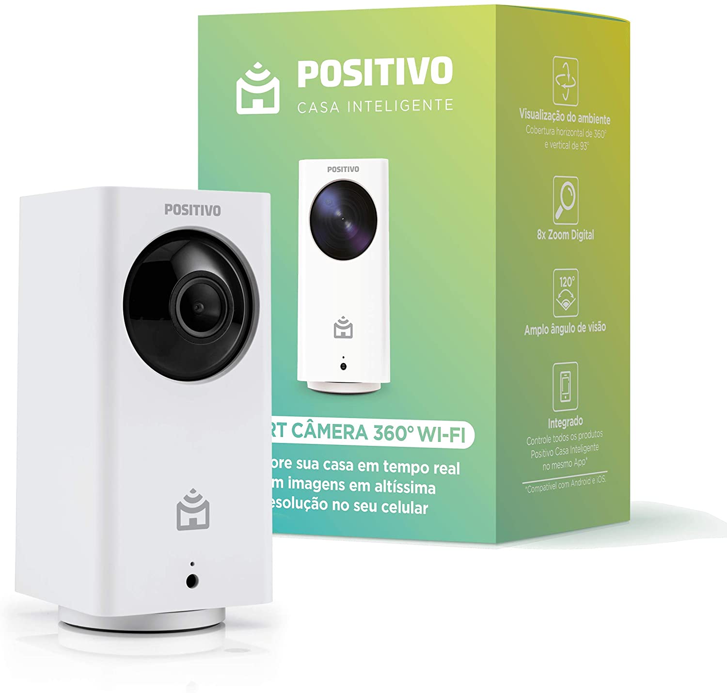 Fácil de instalar e super tecnológica, a Smart Câmera da Positivo Casa Inteligente é ideal para quem deseja mais segurança. Com resolução de 1080p full HD, cobertura 360º, abertura de 120º e zoom digital de 8x, ela também conta com áudio bidirecional, alto-falante e microfones integrados.