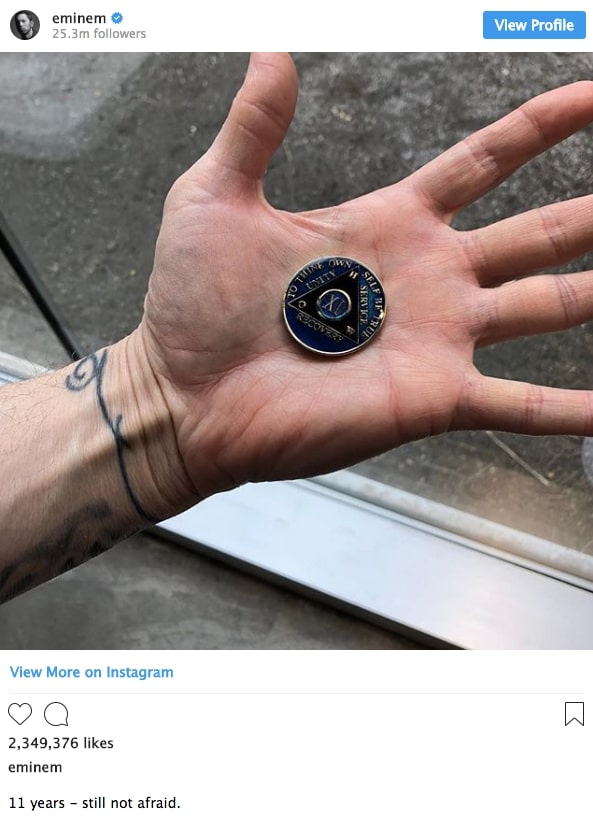 No último domingo, 21, Eminem publicou em seu Instagram uma foto da medalha que ganhou por copletar 11 anos de sobriedade.