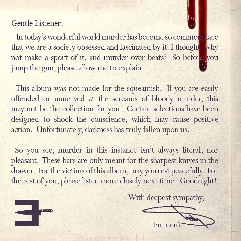Então veja bem, assassinato, nesse caso, nem sempre é literal, nem agradável. Essas rimas são apenas para as facas mais afiadas da gaveta. Para as vítimas desse disco, que vocês descansem em paz. Para o resto, por favor, ouçam com mais atenção da próxima vez. Boa noite!”