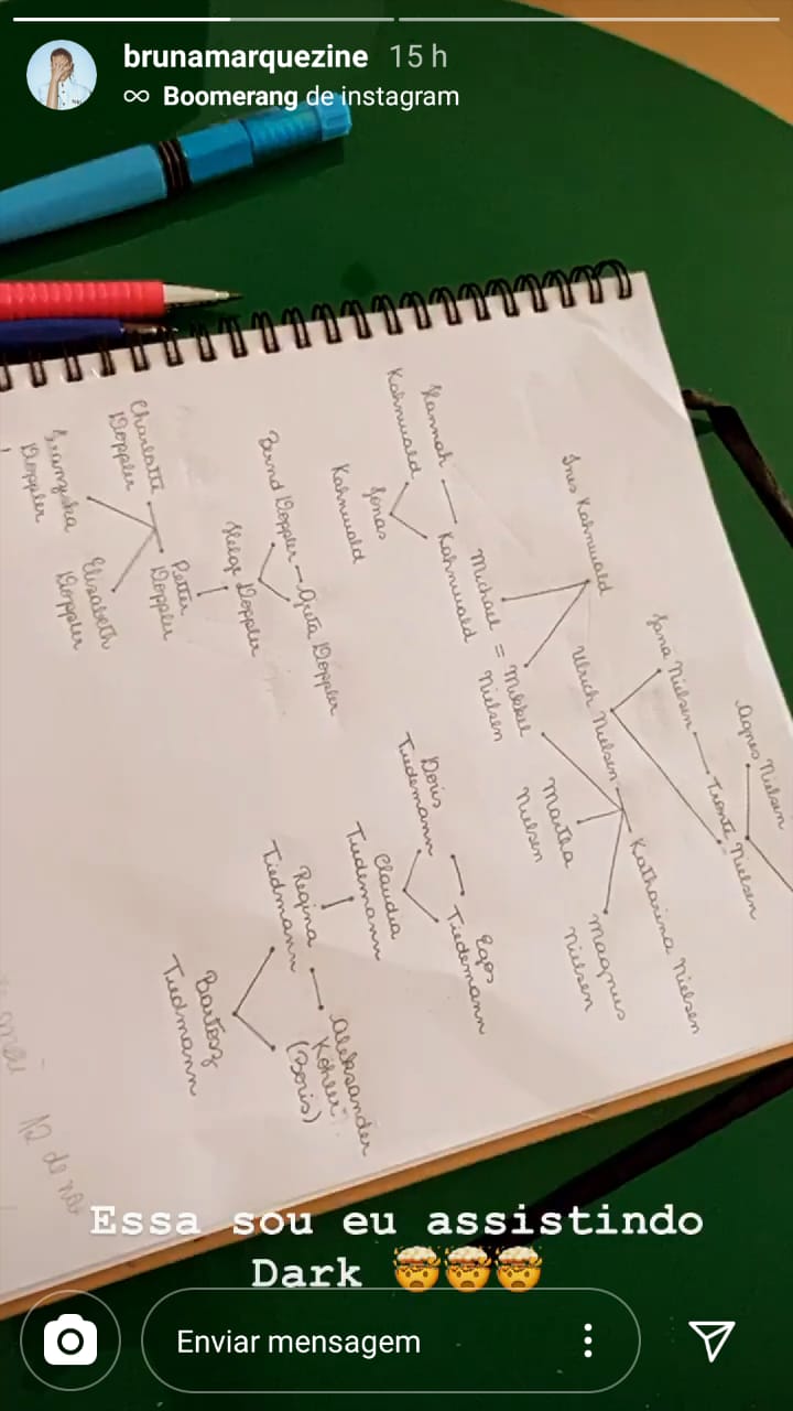 Finalmente, no último sábado, 27, aconteceu a estreia da terceira e última temporada de Dark, série alemã da Netflix. Como era de se esperar, a trama do novo ano do seriado é cheio de conceitos, personagens, linhas do tempo, o que confunde bastante a cabeça do telespectador. O programa é tão confuso que Bruna Marquezine foi gente como a gente e precisou desenhar para não se perder.