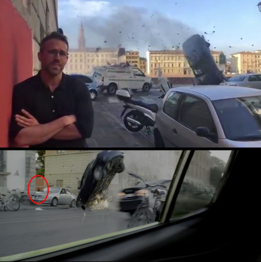 E os espectadores atenciosos perceberam que este momento dos bastidores foi incluído no corte final do filme. Reynolds aparece apoiado na parede vermelha da rua quando, na cena, deveria estar dentro de um dos carros perseguidos. Confira a montagem feita pelo site We Got this Covered: