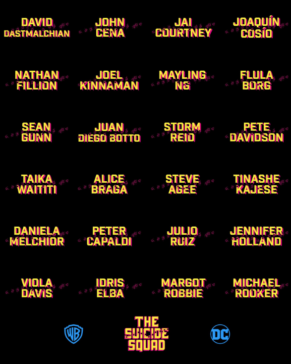 Além dela, outros nomes são destaques na lista de atores: David Dastmalchian, John Cena, Idris Elba, Nathan Fillion, Sean Gunn, Pete Davidson, Taika Waititi, conhecido como o diretor de Thor: Ragnarok, Peter Capaldi de Doctor Who e Michael Rooker, o Yondu de Guardiões da Galáxia.