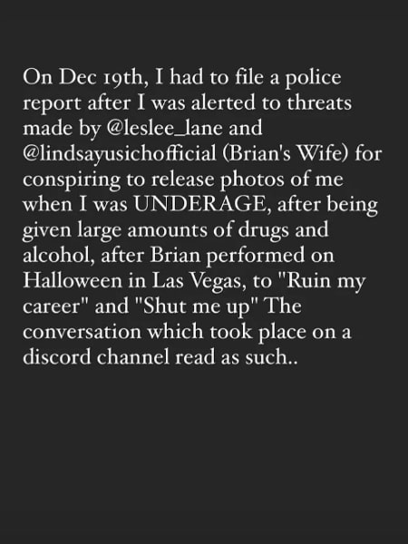 Nos stories, a atriz postou um print do B.O., feito em dezembro de 2020, e também falou sobre Leslee Lane, presidente de um fã-clube de Marilyn Manson, e Lindsay Usich “conspiraram” em publicar fotografias íntimas de Evan Rachel Wood quando era menor de idade. Também seriam divulgadas fotos da atriz sob influência de drogas em Las Vegas, durante show um do dono de “The Beautiful People.”