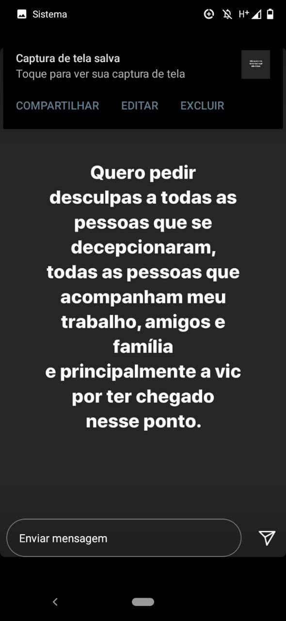 O músico finalizou: “Não quero me defender aqui. Não é isso. Quero pedir desculpas a todas as pessoas que se decepcionaram, todas as pessoas que acompanham o meu trabalho, amigos e família, e principalmente a Vic por ter chegado a esse ponto”.