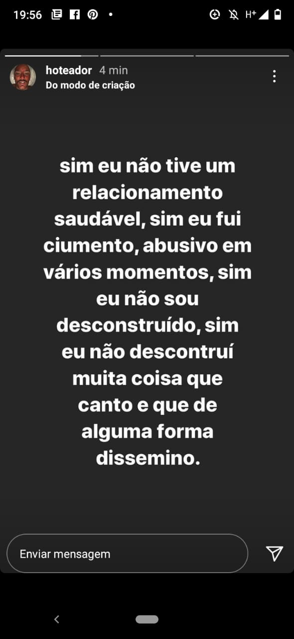 Em resposta, Hot se manifestou pelo stories do Instagram confirmando o caso: “Sim, eu não tive um relacionamento saudável. Sim, eu fui abusivo em vários momentos. Sim, eu não sou desconstruído. Sim, eu não desconstruí muita coisa que canto e que, de alguma forma, dissemino”.