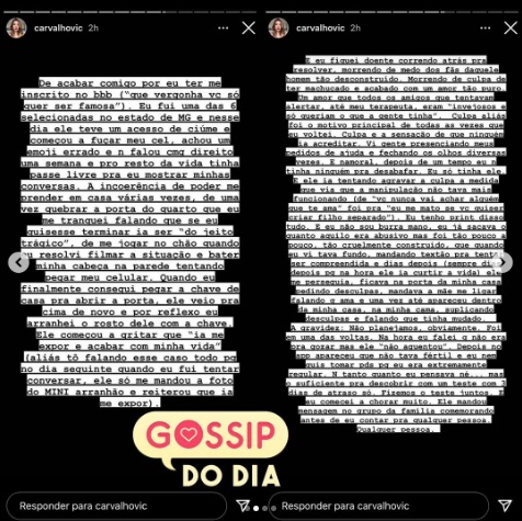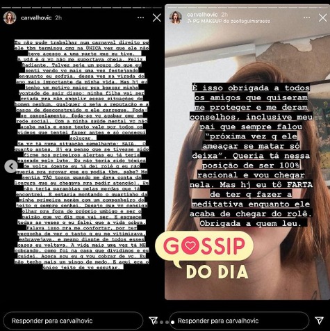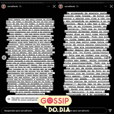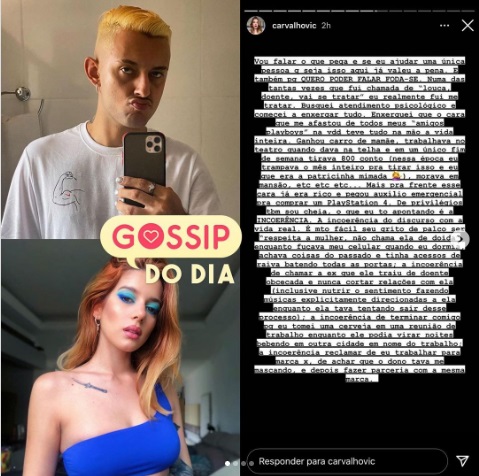 “A incoerência de chamar a ex que ele traiu de doente obcecada e nunca cortar relações com ela, inclusive, nutrir o sentimento fazendo música explicitamente direcionada a ela, enquanto ela estava tentando sair desse processo. A incoerência de terminar comigo porque eu tomei cerveja em uma reunião de trabalho, enquanto ele podia virar noites bebendo em outra cidade em nome do trabalho. A incoerência de reclamar de eu trabalhar para marca x, de achar que o dono estava me mascando, e depois fazer parceria com a mesma marca”, desabafou ela.