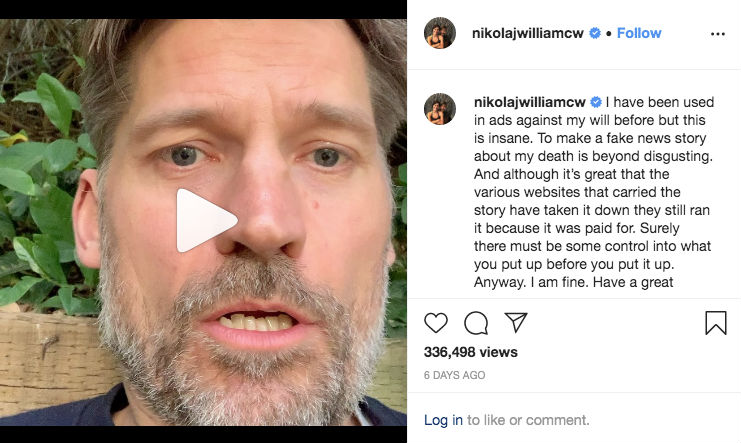Diversos veículos dinamarqueses noticiaram a morte de Nikolaj Coster-Waldau, intérprete de Jamie Lannister em Game Of Thrones. Em um vídeo publicado no Instagram, o ator desmentiu a informação e criticou os sites responsáveis pela propagação de conteúdos falsos.