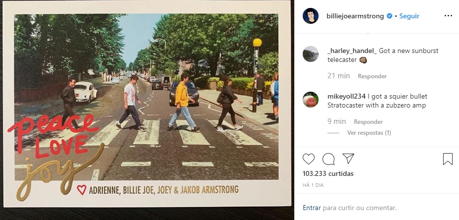 Na última quinta, 26, Billie Joe Armstrong, líder do Green Day, publicou uma foto no Instagram em que mostra a própria família recriando a icônica capa de Abbey Road, dos Beatles.