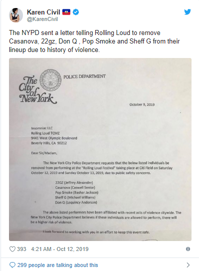 No dia 9 de outubro, a polícia nova-iorquina emitiu uma carta à Rolling Loud. Nela, a polícia solicitou que o festival retirasse os rappers Casanova, Pop Smoke, Sheff G, Don Q e 22GZ da programação. A carta foi postada no Twitter pela estrategista norte-americana Karen Civil.