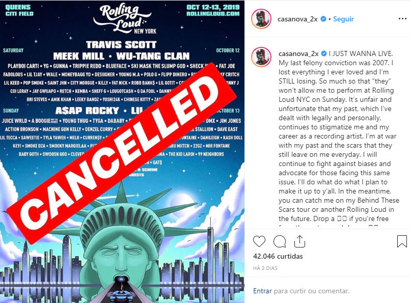 Casanova – ou Caswell Senior – compartilhou no Instragram uma mensagem depois da apresentação ser cancelada. “Quero apenas viver. Minha última condenação criminal foi 2007. Eu perdi tudo que já amei e ainda estou perdendo. Tanto que ‘eles’ não me permitiram tocar no Rolling Loud de Nova York no domingo.”