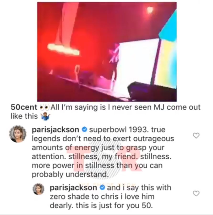 “Superbowl 1993. Lendas de verdade não precisam gastar absurdos de energia só para conseguir a sua atenção. Quietude, meu amigo. Quietude. Há mais poder nisso do que você provavelmente pode entender,” escreveu Paris. ”E eu digo isso com nenhuma intenção de ofender Chris [Brown], eu amo muito ele. Isso é apenas sobre você, 50,” completou.