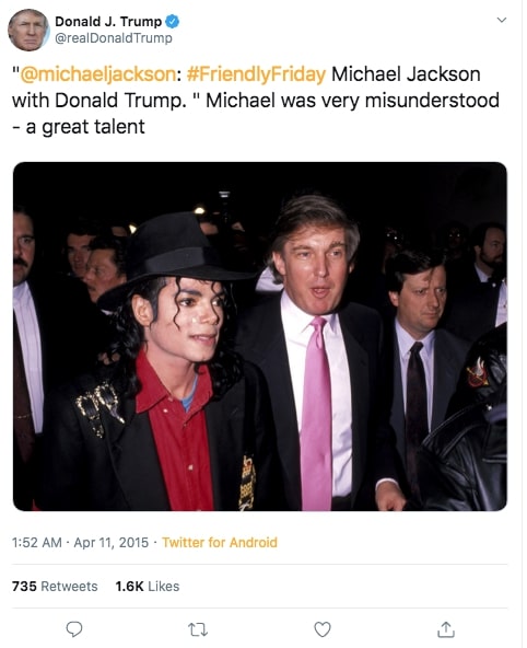 Ainda, quando Michael Jackson foi acusado de pedofilia, a família do presidente o defendeu. Ivana Trump, ex-esposa do presidente, publicou no livro dela em 2017: “Eu nunca acreditei nas acusações de que ele teria molestado aquelas crianças. Não existe nenhuma chance dele ter machucado alguém.”