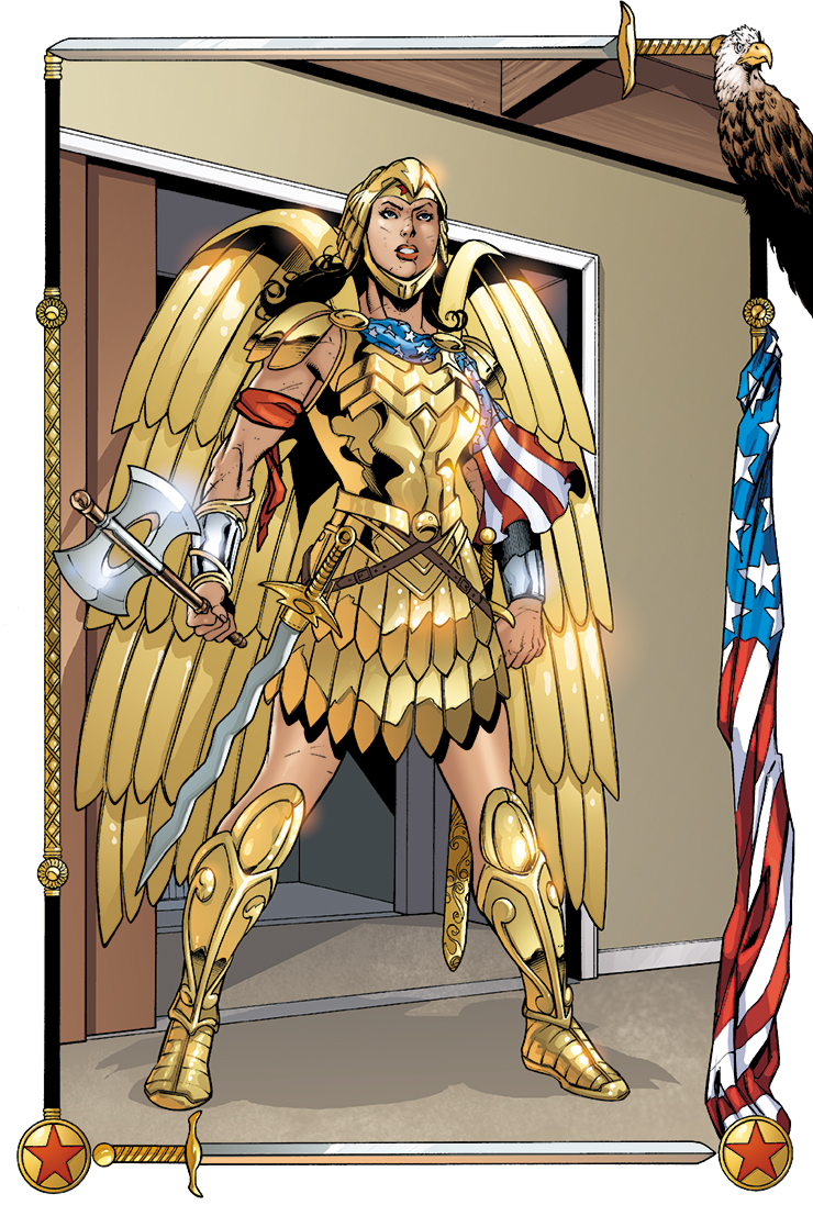 A roupa que a personagem aparece vestindo se assemelha à armadura da Águia Dourada, traje usado por Diana em uma várias edições do quadrinho dos quadrinhos da DC. Compare com a imagem abaixo.