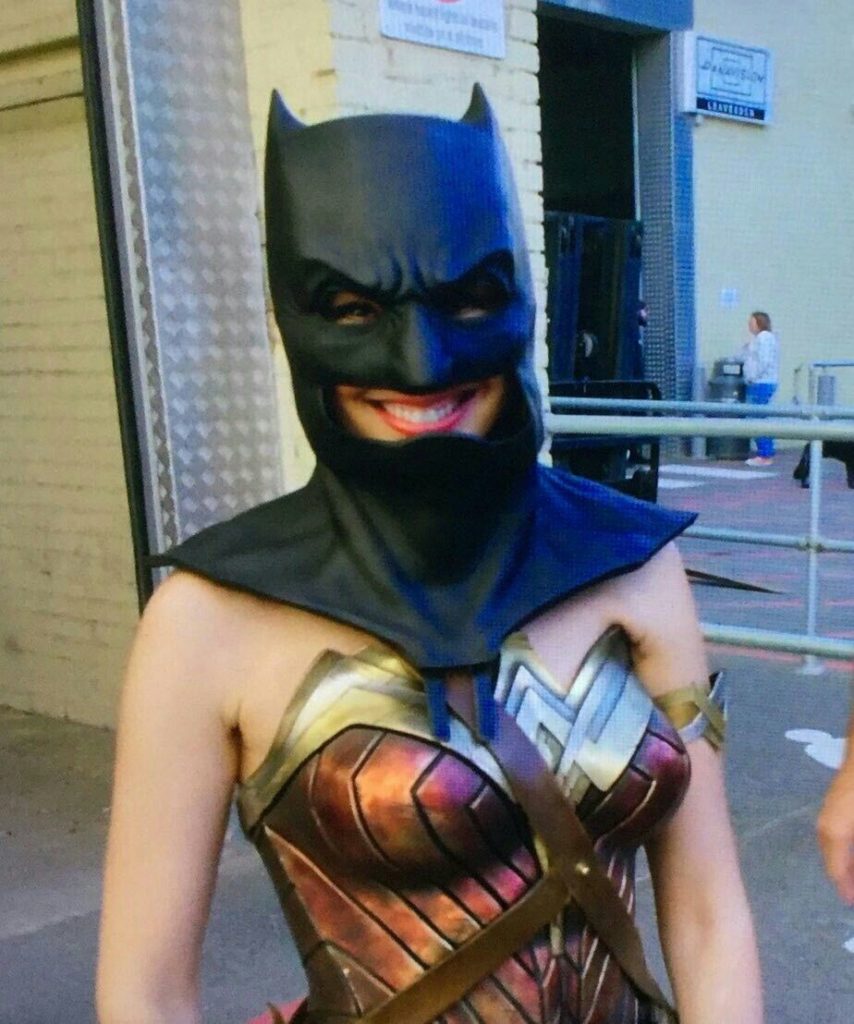 Enquanto aguardamos a edição da produção, aqui está uma foto (via O Vício) de Gal Gadot (Mulher-Maravilha) com o capuz do Batman para relembrar as filmagens no set. Veja abaixo: