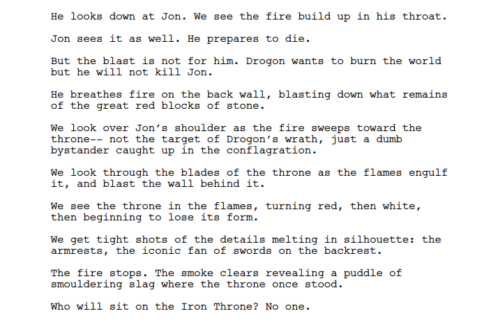 Depois da nomeação, o roteiro do episódio final da série The Iron Throne foi disponibilizado online pelo site do Emmy e deu uma resposta para uma das perguntas mais intrigantes do episódio final: por que Drogon derreteu o Trono de Ferro?