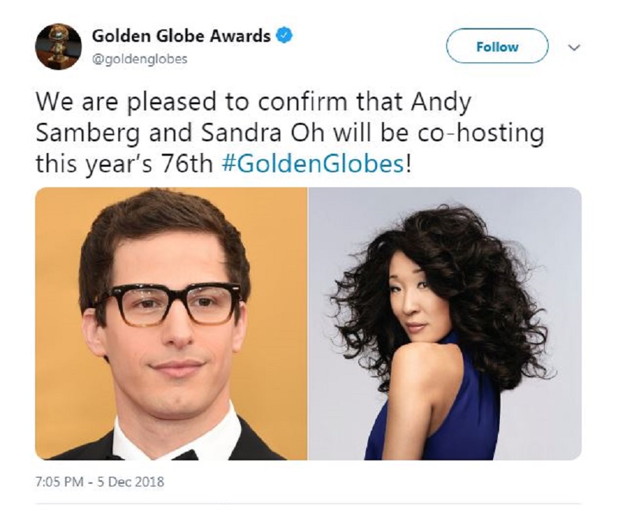 Depois do Oscar anunciar Kevin Hart como apresentador do prêmio em 2019, chegou a vez do Globo de Ouro confirmar a dupla de apresentadores da 76 ª edição: Andy Samberg e Sandra Oh.