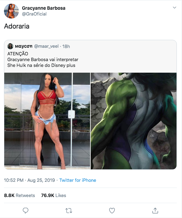 Gracyanne Barbosa é uma modelo fitness bastante ativa em sua conta do Twitter. Neste domingo, 25, um perfil na rede social sugeriu a brasileira para o papel da heroína She-Hulk na nova série do Disney +, plataforma de streaming da Disney.