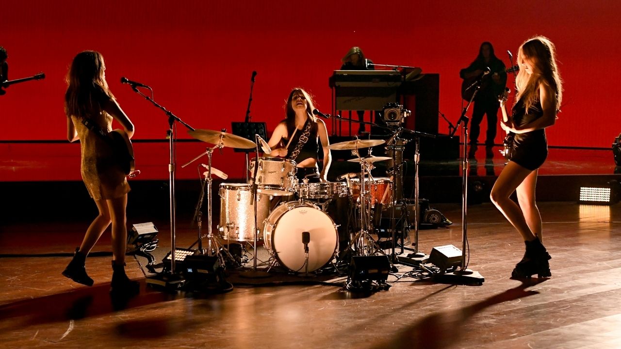 As irmãs Haim apresentaram “The Steps“, do disco Women In Music Pt. III logo no começo da cerimônia. Apesar de não ter sido a performance mais chamativa da edição, as artistas encantaram ao revezarem no instrumentos. (Fotos: Kevin Winter/Getty Images