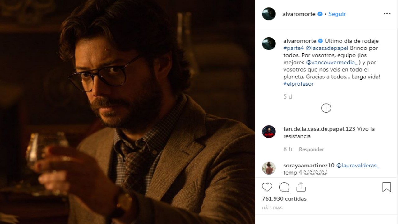 Álvaro Morte, o Professor, também usou a mesma rede social para comemorar o fim das gravações: “Último dia de rodagem #parte4 de La Casa de Papel. Brindo por todos. Por vocês, equipe (os melhores @vancouvermedia_ e por vocês que nos assistem em todo o planeta. Obrigado a todos. Longa vida! #elprofesor”, escreveu.