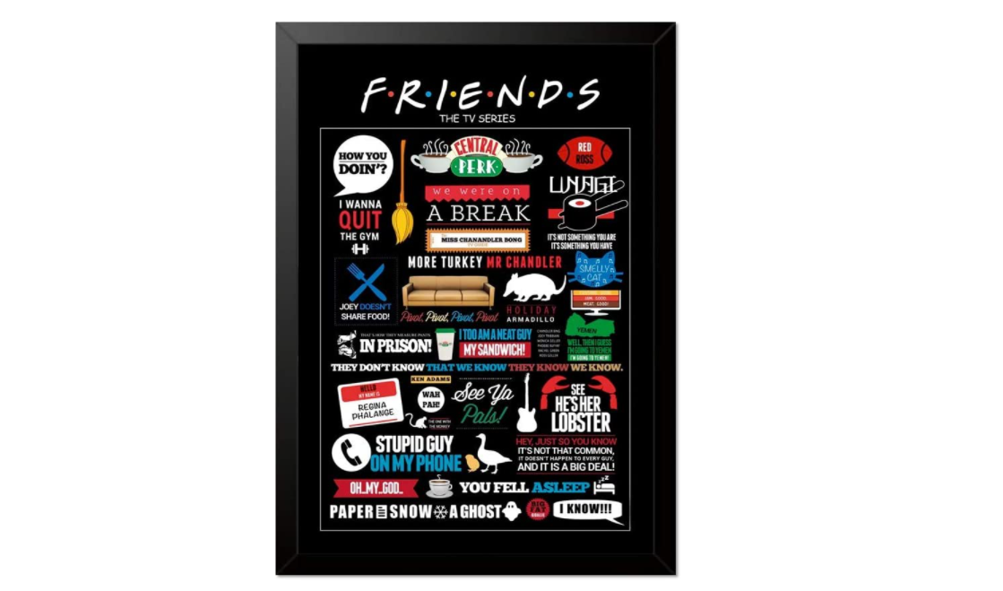 5. Quadro Pôster Friends: decore sua casa no melhor estilo! O quadro reúne frases icônicas da série para você reconhecer outros fãs de looonge. – https://amzn.to/3iVGlhQ
