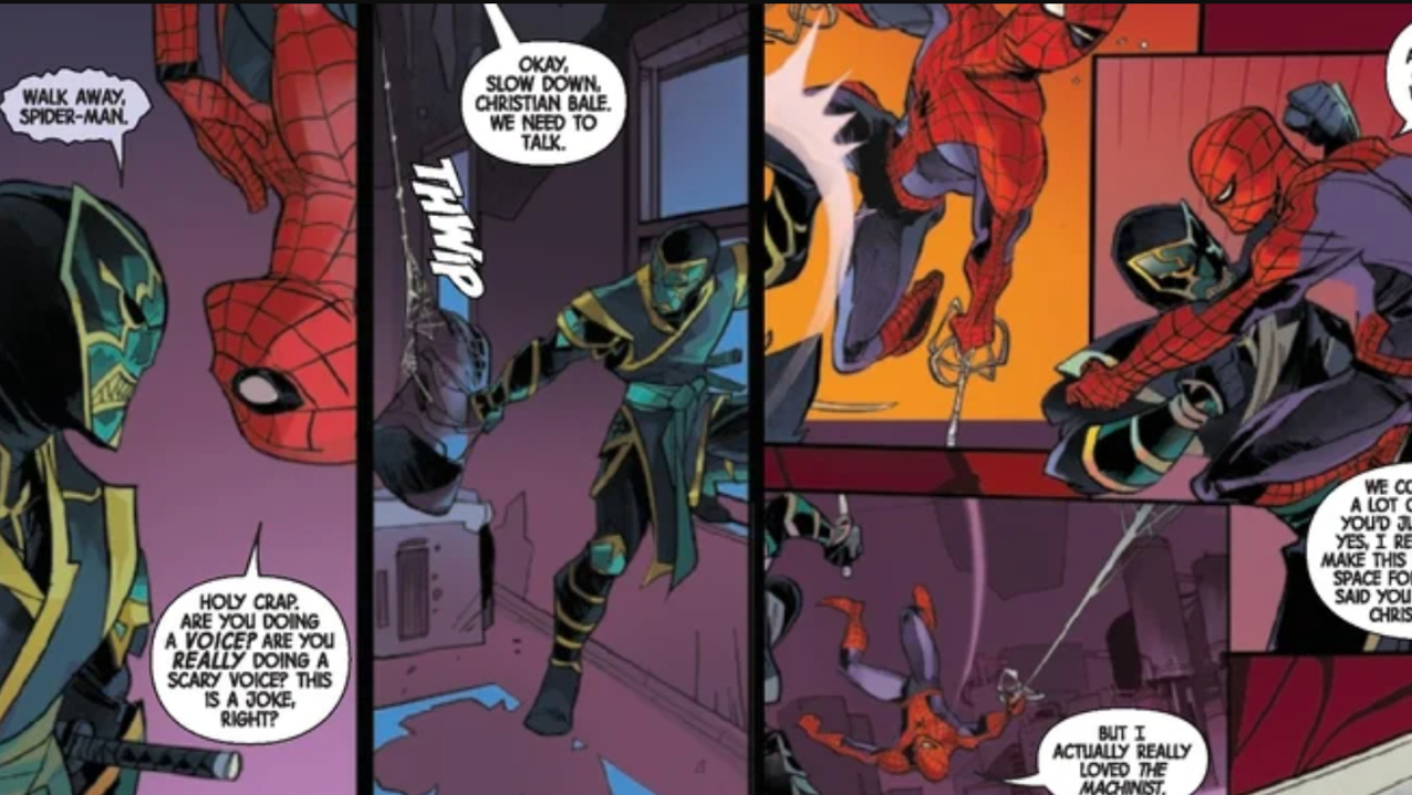Em tradução livre: [Vilão]“Afaste-se, Homem-Aranha” [Aranha] ”Sério? Você está fazendo uma voz assustadora?! Essa é uma brincadeira, né? Ok, vamos com calma, Christian Bale. Precisamos conversar.”