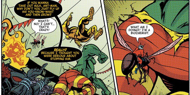 Motoqueiro Fantasma, no circo, começa a provocar Hulk. O grandão verde perde o controle, e começa a destruir tudo. Então, o “vilão” tem uma ideia, e sussura pro Homem-Formiga: “Se você quer impedir o Hulk, por que não voa dentro do você-sabe-o-que dele e então cresce?” O homem inseto recusa, claro, e diz que é loucura.
