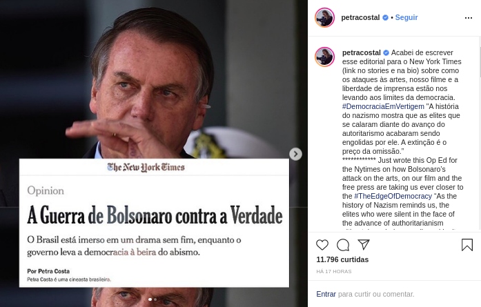 Na última sexta, 24, o jornal The New York Times publicou um texto opinativo assinado por Petra Costa, indicada ao Oscar 2020 na categoria de melhor documentário pelo filme Democracia em Vertigem.