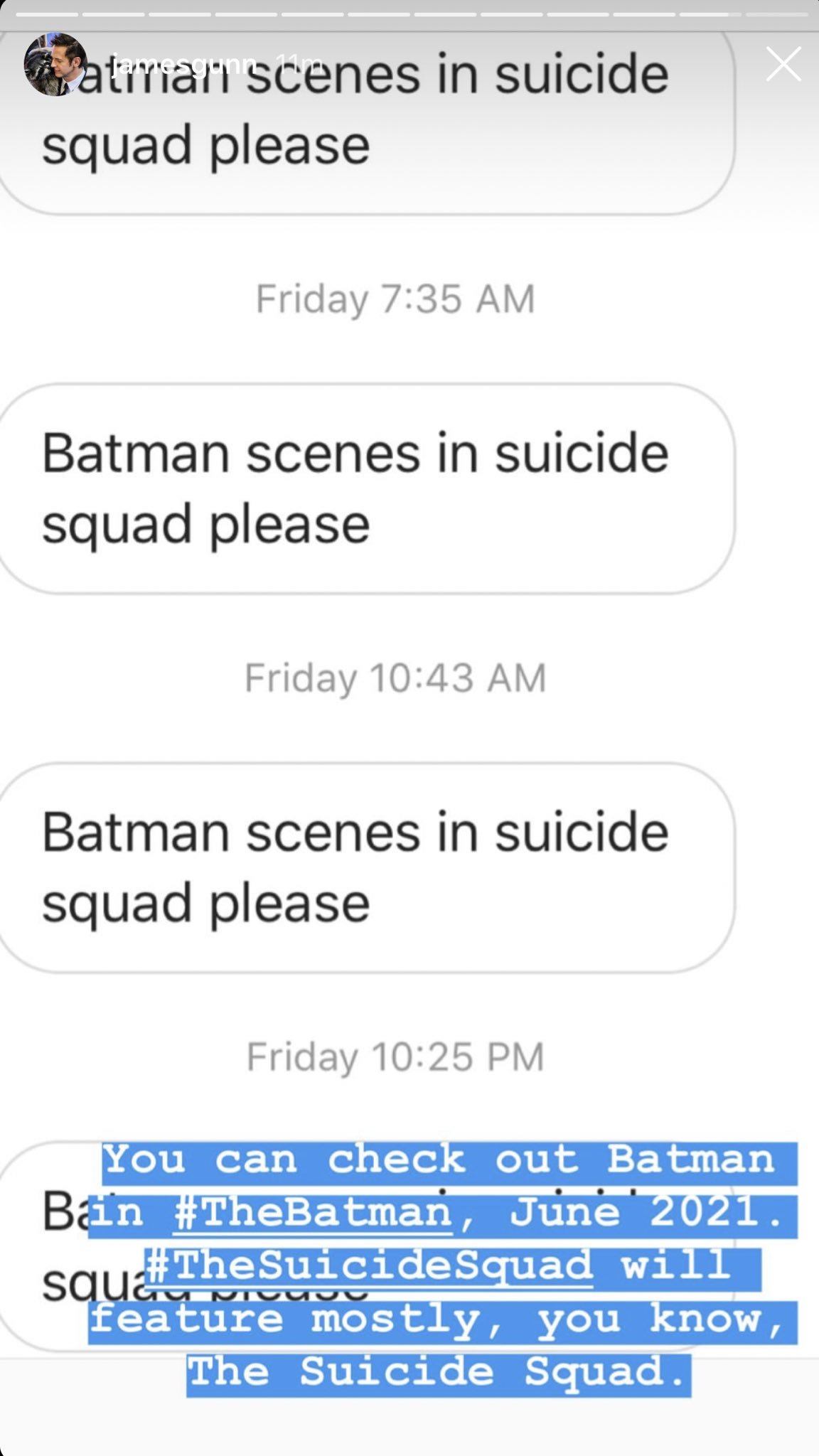 Bem-humorado, o diretor postou uma resposta pública a um fã particularmente insistente no Instagram “Você pode ver o Batman em #TheBatman, que chega aos cinemas em junho de 2021. #OEsquadrãoSuicida terá principalmente, você sabe, O Esquadrão Suicida“.