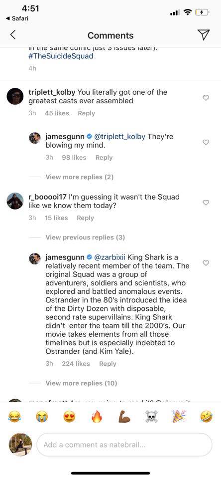 “O personagem Tubarão-Rei é um membro recente do time. O Esquadrão original era um grupo de aventureiros e cientistas, que exploravam e batalhavam em eventos anormais. Ostrander nos anos 1980 introduziu a ideia do filme Os Doze Condenados, com vilões descartáveis e não tão conhecidos. O Tubarão-Rei só entrou na equipe nos anos 2000. Nosso filme pega elementos de todas essas linhas temporais, mas dá crédito especialmente ao que fez Ostrander (e Kim Yale).”