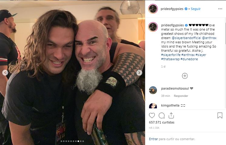 Na última terça, 11, Jason Momoa acompanhou a apresentação do Slayer e do Anthrax em Budapeste, na Hungria, e compartilhou o momento no Instagram.