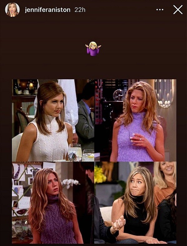 Pelo stories do Instagram, Jennifer Aniston compartilhou uma montagem de três fotos de Rachel Green em Friends usando o mesmo estilo de roupa. A quarta foto da publicação é do especial Friends: The Reunion, em que a atriz de 52 anos voltou a usar o mesmo tipo de peça.