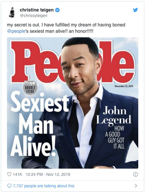 Já Chrissy, comemorou o título em um post no Twitter e escreveu: “Meu segredo foi revelado. Atingi meu sonho de ter transado com o homem mais sexy do mundo da People! Que honra!”.