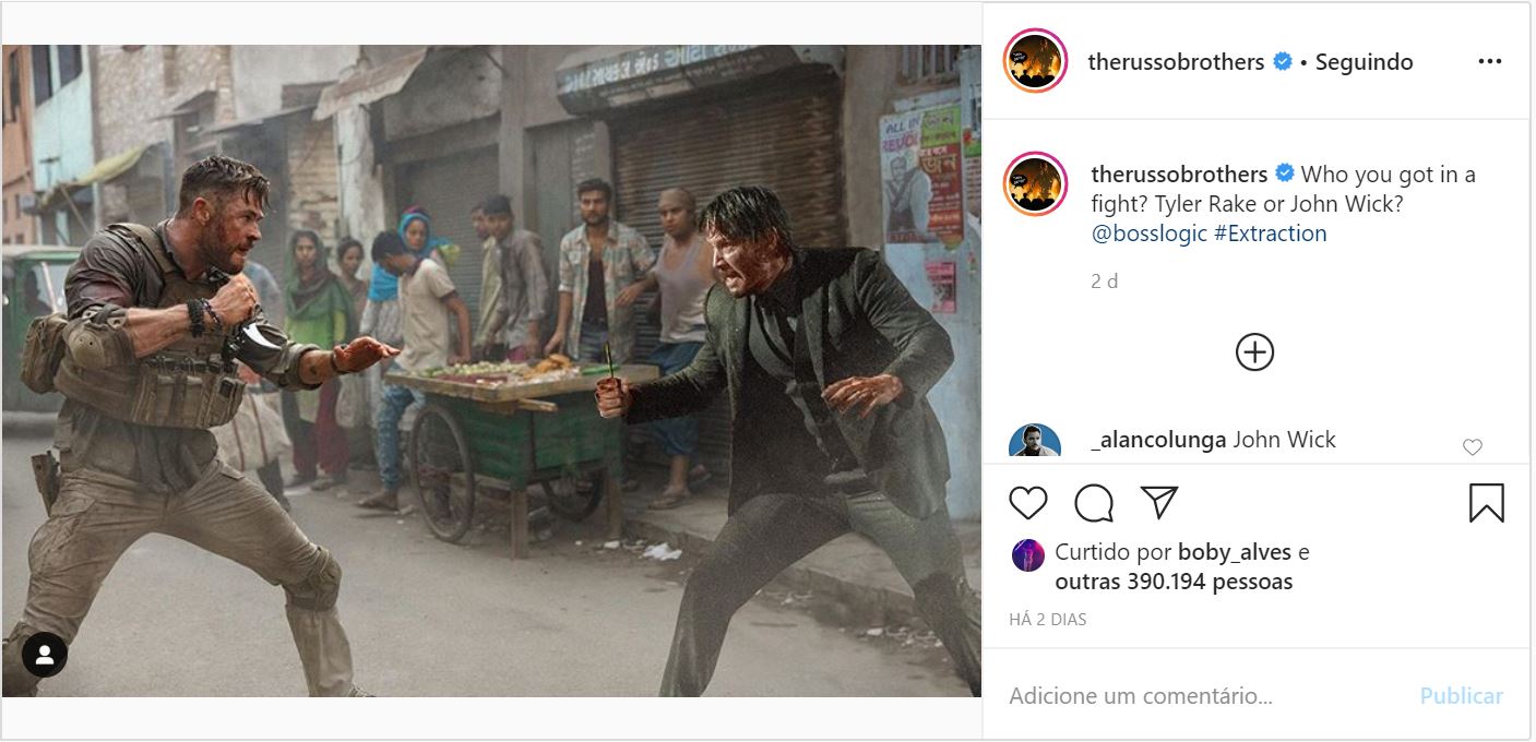 Até a própria conta oficial da franquia John Wick resolveu comentar sobre a arte via tuíte: “Isso é mesmo uma pergunta?” Resgate já está disponível na Netflix. Além da produção dos irmãos Russo, o longa foi dirigido por Sam Hargrave, coordenador das lutas de Vingadores: Ultimato (2019) e Atômica (2017).