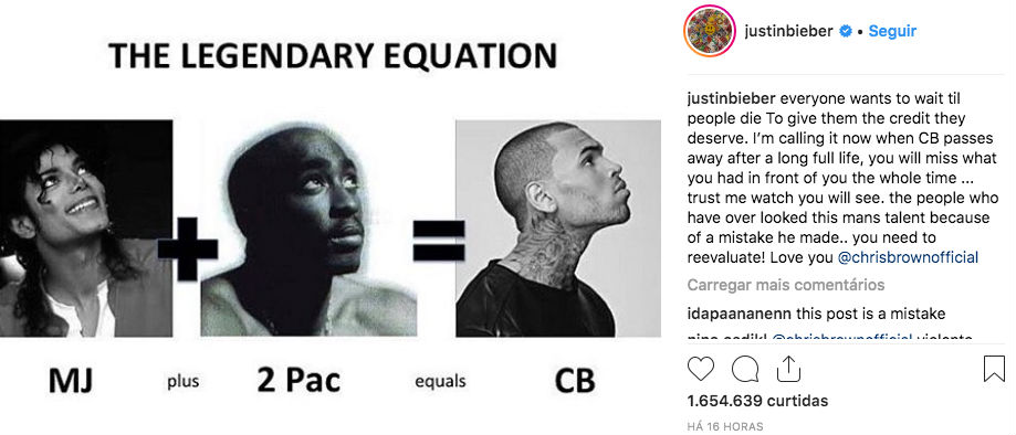 Na sexta-feira, 3, Bieber usou as redes sociais para publicar uma imagem de Brown na qual mostrava que o cantor era uma união entre Michael Jackson e Tupac Shakur. Na legenda, ele explicava que a arte de Brown era subvalorizada, tal qual o artista pop e o rapper.