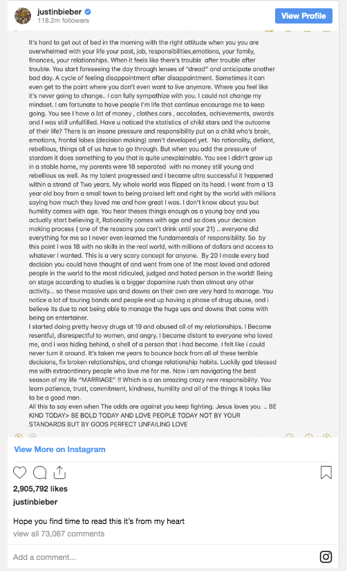 “É um ciclo de decepção atrás de decepção. Às vezes isso até chega ao ponto em que você não quer mais viver. Em que você sente que nunca vai mudar… Eu simpatizo totalmente com você. Eu não poderia mudar minha mentalidade. Eu sou feliz por ter pessoas na vida que continuam me encorajando para continuar. Vocês veem que eu tenho muito dinheiro, roupas, carros, elogios, conquistas, prêmios, mas eu ainda estava vazio”, escreveu Bieber.