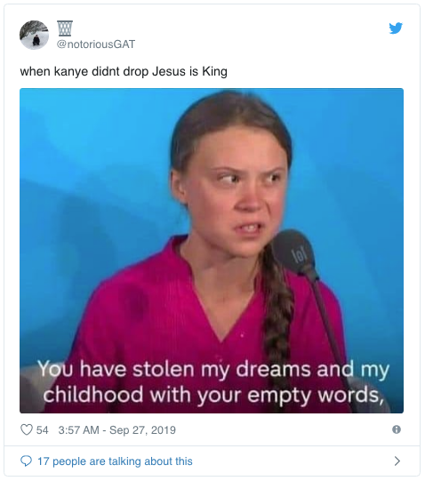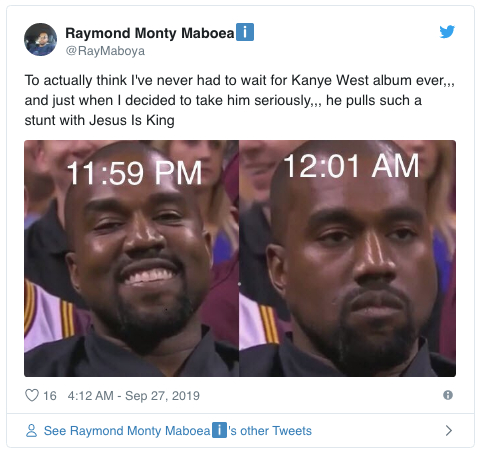 “Em pensar que eu nunca tive que esperar por nenhum álbum do Kanye West, e justo quando eu decido levá-lo a sério, ele dá uma manobra com Jesus Is King.”