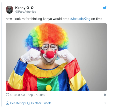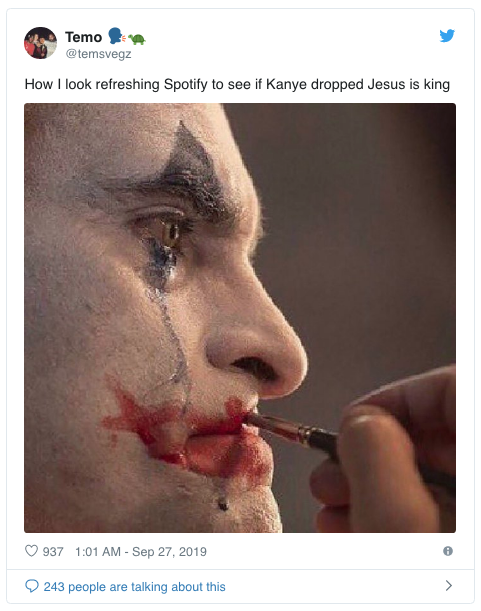 Quando Jesus Is King não apareceu, os seguidores do rapper reagiram com ironia e frustração. Um deles escreveu “Me queimando com as promessas quebradas de Kanye West (de novo)”, enquanto outro postou uma foto do Coringa de Joaquin Phoenix com a legenda: “Como eu pareço atualizando o Spotify para ver se Kanye já soltou Jesus Is King.”