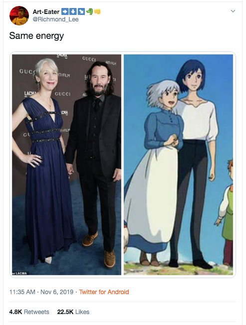 A parceira do ator é comparada com a personagem Sophie, que também possui cabelo cinza e usa um vestido azul na imagem. Já Reeves é comparado com Howl, o mago de cabelos compridos e calça preta.